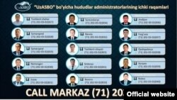Молия вазирлиги ходими томонидан жўнатилган қуйидаги суратда “UzASBO бўйича ҳудудлар администраторларининг ички рақамлари” кўрсатилган: