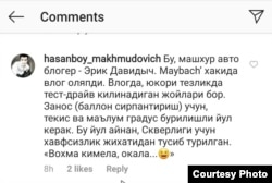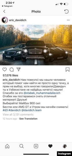 Ўз постида Эрик унга одамлар Ўзбекистонда арзирли улов тополмайсан дейишганини, лекин Отабек Муҳаммадалиевич (Умаров) бир эмас, учта машина: Maybach, Bentley ва AMG GT автомобилларини бериб турадиган бўлганини ёзди.