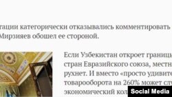 “Аммо, икки давлат раҳбарлари Владимир Путин ва Шавкат Мирзиёевнинг 5 апрелдаги учрашувидан маълум бўлдики, иқтисодий алоқаларнинг қайта тикланишини Тошкент фақат ҳамкорлар олдидаги қатъий мажбуриятларсиз МДҲ доирасида кўрмоқда ва Евросиё иттифоқига қўшилишга шошилмаётир”, деб ёзди Газета.ру.