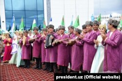 Мажмуада президентларни ўзбек ва туркман миллий либосларини кийган болалар қарши олди.