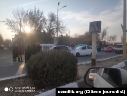 Суратда аёллар пиёдалар йўлагида қаторлашиб тургани улар олдида эса ИИБ машинаси, унинг орқасида ўнга яқин машинанинг тўхтаб тургани акс этган.