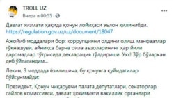 “Ваҳоланки, энг катта ва энг зараркунанда коррупция айнан шу қатлам вакиллари томонидан қўлланади. Бу қонун лойиҳаси навбатдаги “пардоз” қонуни бўлиб қоладиганга ўхшайди”,- дея мулоҳазалари билан бўлишди блогер Н.Сафари.