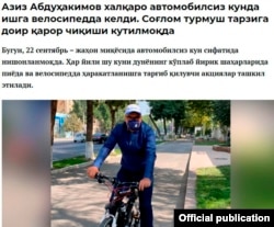 Ўзбекистон бош вазири ўринбосари Азиз Абдуҳакимов 22 сентябрь – халқаро автомобилсиз кун муносабати билан ишга велосипедда борди (www.kun.uz, 22 сентябрь).