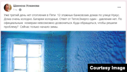 "Нукус кўчасидаги бешта 12 қаватли “банк” уйларида уч кундирки иссиқлик йўқ. Хонадонлар совиб ётибди. Батареялар муздек. “Тошиссиққуввати” бир гапни тутиб олган – босим йўқ. Расмий телефон рақамларига боғланиб бўлмаяпти. Муаммони ҳал этиш учун қаерга мурожаат қилиш керак? Қиш ўзи энди бошланди-ку".