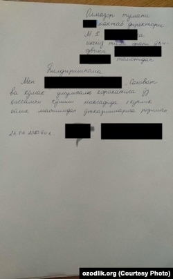 Тошкентнинг Олмазор туманидаги мактаблардан бирининг ўқитувчиси жамғармага пул ўтказиш учун ёзган розилик аризаси нусхасини Озодликка йўллади.
