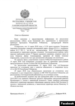 Мактубда айтилишича, Диана Еникееванинг фожеали ўлими бўйича Ўзбекистон ЖКнинг 266-моддаси, 2-қисми асосида 14 март куни қўзғатилган жиноят иши суриштируви тугаб, 29 март куни иш судга оширилган.
