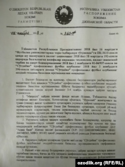 Озодлик қўлга киритган ҳокимнинг ушбу фармойиши нусхасида клуб учун пул йиғиш акцияси доирасида 3-4 ноябрь кунлари хайрия ҳашари ўтказиш лозимлиги ва вилоятдаги "бошқарма, идора ва бошқа ташкилотларда меҳнат қилаётган ходимларнинг бир кунлик иш ҳақи миқдоридаги маблағ"ни “Сўғдиёна” клуби ҳисоб рақамига ўтказиб бериш буюрилган.