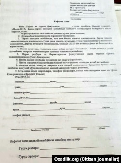 Бу ҳужжатга фахрли 3- ўринни раво кўрганимизга унинг анчайин пухта ёзилгани сабаб бўлди. Бу ҳужжатни имзолаган талаба ота-онасининг шахсига оид барча маълумотларни институт раҳбарларига тақдим этиш мажбуриятини ҳам зиммасига олганки, бу маълумотлар пахтадан кейин ҳам керак бўлиши, муҳими – институт раҳбарияти билан ота-оналар ўртасида чин инсоний муносабатларнинг мустаҳкамланишига ҳисса қўшади.