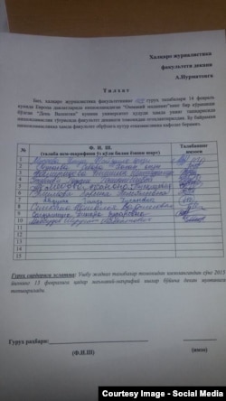 Ўзбекистон Давлат жаҳон тиллари университети халқаро журналистика факультети талабалари “Валентин куни”ни нишонламаслик тўғрисида тилхат берган. 2015 йили ёзилган бу ҳужжат билан талаба “факультетни обрўсизлантирмасликка кафолат берган”: