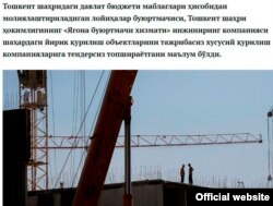 Ўзбекистон пойтахтида давлат бюджети маблағлари ҳисобидан молиялаштириладиган лойиҳалар буюртмачиси, Тошкент шаҳри ҳокимлигининг “Ягона буюртмачи хизмати” инжиниринг компанияси йирик қурилиш объектларини тажрибасиз хусусий қурилиш компанияларига тендерсиз топшираётгани маълум бўлди, деб ёзади Телеграмдаги Davletov.uz канали.
