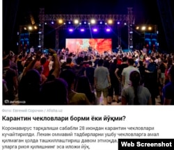 Ўзбекистонда коронавирус тарқалиши тезлашгани ортидан 28 июндан карантин чекловлари кучайтирилди. Лекин оммавий тадбирларни ушбу чекловларга амал қилмаган ҳолда ташкиллаштириш давом этмоқда (www.gazeta.uz, 30 июнь).