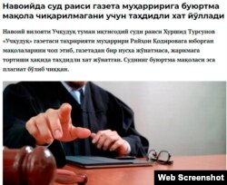Маълум бўлишича, судья Учқудуқ туман ҳокимлиги нашри саналган газетага икки марта мақола юборган, аммо улар чоп этилмаган. “Иши юришмаган” суд раиси жорий йил 4 февралида таҳририятга таҳдидли нома жўнатган. Ёзма жавоб йўлланмагани важидан таҳририятга пўписа қилган судья “Жисмоний ва юридик шахсларнинг мурожаатлари тўғрисида”ги қонунни асос қилиб кўрсатган. Ҳолбуки, мазкур қонун талаби давлат органларининг, шунингдек, улар таркибий бўлинмаларининг ўзаро ёзишмаларига нисбатан татбиқ этилмайди.