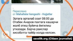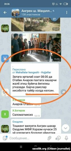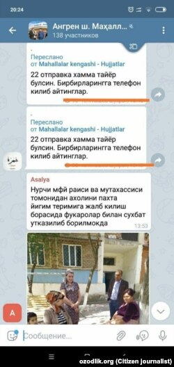 АНГРЕН. “Тошкент вилоят, Ангрен шаҳридан ёзмоқдамиз. Ҳоким ўринбосарлари маҳалла фаолларини пахта деб ҳоли-жонига қўймаяпти. Маҳалла раиси ва котиблари тонг демай, тун демай, уйма-уй юриб, теримга ҳашарчи қидирмоқда. Ишсиз оилаларга кирмоқдамиз, аммо улар ҳам теримга боришни хоҳламаяпти. Ҳар бир маҳаллага кунлик 600 кило пахта юкланган. Эрталаб соат 8 дан терим бўйича йиғилишга чақиришмоқда. “Бюджет ташкилотлар пахтага бормайди” деганда, фақат ўқитувчи ва шифокорлар назарда тутилган шекилли. Пахтани қачонгача биров экади-ю, жабрини бошқалар тортади?!”