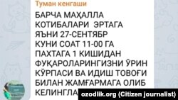 ЗАНГИОТА. “Тошкент вилояти Зангиота туманидаги маҳалладан ёзмоқдаман. Туманимиз ҳокими пахта терими бошланиши арафасида ҳудуд раҳбарлари ва МФЙ раисларини йиғиб, ҳар бир ҳудудга маълум миқдорда теримчи йиғишни топширган. Бизнинг маҳалла 20 нафар ҳашарчи топиши керак. Уларни эса вилоятлардан ёллаш мумкин, холос. Битта ҳашарчининг йўлкираси, 3 маҳал овқати ва иш ҳақи 1,5 миллион сўмни ташкил этмоқда. Демак, битта маҳалла 20 та ҳашарчи учун 30 миллион сўм сарфлаши керак. Маҳалла раислари бунча пулни қаердан топишни билмай қолди. Одамлардан йиғайлик десак, табиийки, улар норози бўлади, шикоят қилади. Энди эса ҳашарчиларни боқиш учун маҳалла ходимларининг икки ойлик маоши ушлаб қолинади, дейишмоқда. Нима, пахтани фақат маҳаллага чиқарганми? Оммавий ахборот воситаларида мажбурий меҳнатга йўл қўйилмайди, дейилмоқда. Амалда эса...”