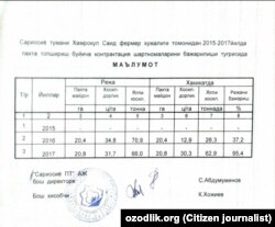 29 октябрь. Ўзбекистонлик блоггерлардан бири 28 октябрь куни "Хамрокул-Саид-даласи"нинг пахта топшириш бўйича контрактация шартномаларини бажарилиши тўғрисидаги ҳужжатни Озодликка Телеграм орқали юборди. Фермер Боймуҳаммад Саидов Озодлик мухбири билан телефон орқали бўлган суҳбатда бу ҳужжатдаги акс этган маълумотни тан олди, бироқ 2017 йилдаги пахта режаси 95% бажарилганини қўшимча қилди: