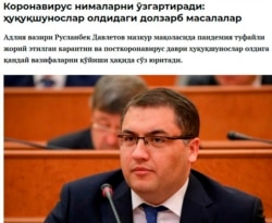 Ўзбекистон адлия вазири Русланбек Давлетов коронавирус пандемияси даврида шахсий маълумотлар ҳимояси муҳим эканини таъкидлади (www.kun.uz, 14 апрель). Дунё мамлакатлари тажрибасидан маълумки, коронавирусга чалинган шахсларни аниқлаш мақсадида ахборот технологияларидан кенг фойдаланилмоқда. Адлия вазирига кўра, келажакда бу каби амалиёт қатъий назорат остида ва қонунчиликка сўзсиз риоя қилган ҳолда амалга оширилиши лозим. “Ҳар бир фуқаро ўзига тегишли шахсий маълумоти муҳофазаланганини ҳис қилиб, кафолатини сезиб яшаши лозим”, дея таъкидлайди Р. Давлетов.