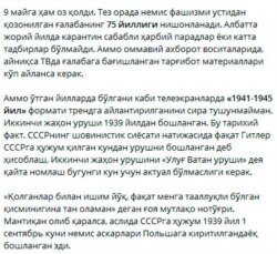 “Афсуски, инсоният тарихидаги энг шармандали, ваҳший ва даҳшатли уруш шимолдаги қасамхўр ва ёлғончи давлатнинг босими билан яна улуғ, дея аталмоқда. Уруш ҳеч қачон улуғ бўлмайди”, деб ёзди блогер Отабек Бакиров.