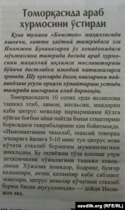 Фарғона вилояти Қува тумани “Боистон” маҳалласида яшовчи Иномжон Буваназаров хонадонидаги мўъжаз тажриба боғида араб хурмосини маҳаллий иқлимга мослаштириш бўйича дастлабки ижобий натижаларга эришди (“Оила даврасида”, 8 март). 10 сотихли томорқасида иссиқхона ташкил этиб, лимон, апельсин, мандарин каби цитрус мевалари парваришини йўлга қўйган боғбон айни пайтда банан етиштириш борасидаги тажрибаларини ҳам бойитмоқда.