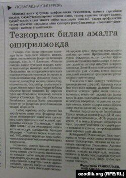 Ўзбекистон Ички ишлар вазирлиги мамлакат бўйлаб “Тозалаш-Антитеррор” тадбири ўтказмоқда (“Постда”, 11 март). Тезкор-қидирув тадбирлари давомида жиноят содир этиб қидирувда юрган 500 га яқин шахс ушланган, бедарак йўқолган 50 дан ортиқ киши топилган. Шунингдек, ноқонуний қурол ва ўқ-дори, тақиқланган диний адабиёт ва гиёҳвандлик моддалари сақлаётган фуқаролар аниқланган. Қайд этилишича, текширув гуруҳлари ўта муҳим объектлар, кўп қаватли уйлар, хонадонлар, корхоналар, меҳмонхоналар ва ётоқхоналарни ўрганиб, турли ҳуқуқбузарликларни аниқламоқда. “Профилактик ҳисобда турган фуқаролар, махсус ҳисобда турган диний-экстремистик оқим аъзолари ва муқаддам судланган шахслар маъмурий назоратга олинмоқда. Доимий яшаш жойидан бошқа давлатларга узоқ муддатга кетган шахслар аниқланиб, ички ишлар органларининг рўйхат ҳисобига киритилмоқда”, дея маълум қилади ИИВ вакили Фурқатжон Ғайбуллаев.