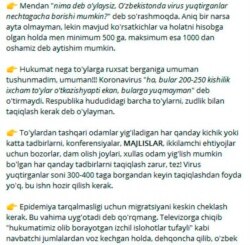 Ўзбекистонда кейинги ойдан бензин нархи ошишига оид овозаларга ойдинлик киритилди. Хитойда фаолият юритаётган олим ўзбек расмийларидан карантиндагиларнинг барчаси зудлик билан тестдан ўтказишни сўради. Конституцияга зид тизимдан воз кечишга ИИВнинг кўзи қиймаяпти. Жорий ҳафта матбуот шу каби воқеалар ҳақида хабар берди.