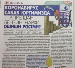 Ўзбекистонда 1 апрелдан коронавирус сабаб бензин нархи ошади деган овоза тарқалди (“Даракчи”, 19 март). Газетага кўра, жаҳон бозорида нефть нархи пастга шўнғиётган бир пайтда бензин ошиши ғалати ҳолатдир. “Ўзбекнефтгаз” акциядорлик жамияти вакили 1 апрелдан бензин нархи ошиши ҳақидаги хабарни асоссиз, деб атаган. Қайд этилишича, жаҳон энергия бозорида нарх пасаяётгани сабаб Ўзбекистонда биржа орқали сотилаётган бензин баҳоси арзонлашиши кутилмоқда.