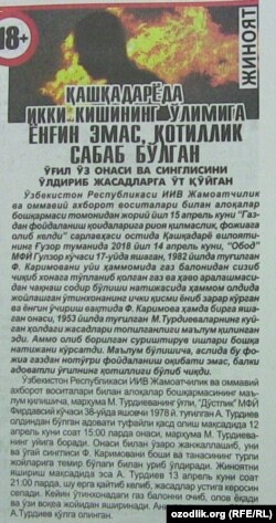 Қашқадарё вилояти Ғузор тумани 14 апрель куни рўй берган ва икки кишининг ўлимига олиб келган ёнғин аслида қотилликни яшириш учун уюштирилган томоша экани маълум бўлди. Бу ҳақда Ички ишлар вазирлиги матбуотга маълум қилган. Дастлаб 1982 йилда туғилган Ф.Каримова ва унинг онаси, 1953 йилда туғилган М.Турдиевалар уй ҳаммомидаги газ баллон носозлиги туфайли юзага келган ёнғинда ҳалок бўлгани тахмин қилинган эди. Аммо суриштирувлардан кейин бу фожиа газдан нотўғри фойдаланиш оқибати эмас, нобакор ўғилнинг қотиллиги бўлиб чиқди. Марҳума М.Турдиеванинг ўғли қирқ ёшли А.Турдиев олдиндан бўлган адовати туфайли 12 апрель куни онасининг уйига боради ва онаси ҳамда ўгай синглиси Ф.Каримовани темир бўлаги билан уриб ўлдиради. Кейин эса жасадлар устига керосин сепиб, уйга ўт қўяди ва ўзи қочиб кетади. Хабарга кўра, А.Турдиев қўлга олинган.