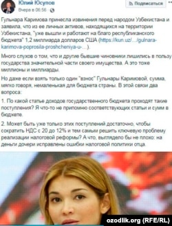Таниқли иқтисодчи Юлий Юсупов Гулнора Каримова томонидан Ўзбекистонга қайтарилгани иддао қилинган 1,2 миллиард доллар маблағ бюджетга кирим қилинган-қилинмагани масаласига эътибор қаратиб, бу борада расмий тушунтириш сўради. “Давлат бюджетининг даромадлар тўғрисидаги қайси моддасига кўра бу каби киримлар амалга оширилмоқда? Негадир шу каби моддалар ва бюджетдаги тегишли суммаларни эслай олмадим”, деб ёзди Ю. Юсупов. Амалдаги солиқ сиёсатини танқидий баҳолаб келаётган мутахассис вазиятдан фойдаланиб масъулларни қўшилган қиймат солиғи миқдорини пасайтиришга ундаган. “Балки мана шу киримлар ҚҚСни 20 фоиздан 12 фоизга туширишга етар ва солиқ ислоҳотидаги асосий муаммони ҳал этишга ёрдам берар? Отасининг солиқ сиёсатида йўл қўйган хатоси қизининг пуллари эвазига тўғриланса, ёмон эмас-ку”, деб ёзган у.