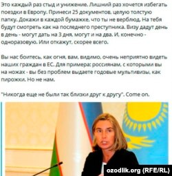 Қайд этилишича, шунча қоғозбозликдан кейин элчихоналар ё бир марталик виза беради, ё сўровни рад этади. Ҳолбуки, ЕИ мамлакатлари муносабатлар ҳамиша таранг бўлган Россия фуқароларига ҳам кўп марталик визани пирожка каби тарқатади.