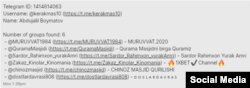 Озодлик радиосига таҳдид юборган иккита аккаунт излари Телеграмдаги бир нечта очиқ чатлардан топилди. Улардан бири¸ Ирландияда яшаëтган ўзбекистонлик таниқли ҳуқуқ ҳимоячиси исмидан фойдаланадиган "Абдужалил Бойматов" аккаунтидир. Бу аккаунтнинг Телеграмдаги олтита очиқ суҳбатда қатнашгани кўрилади.