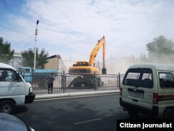 Экскаватор туман марказидаги собиқ Гастроном биносини бузмоқда. 2019 йил, 23 май.