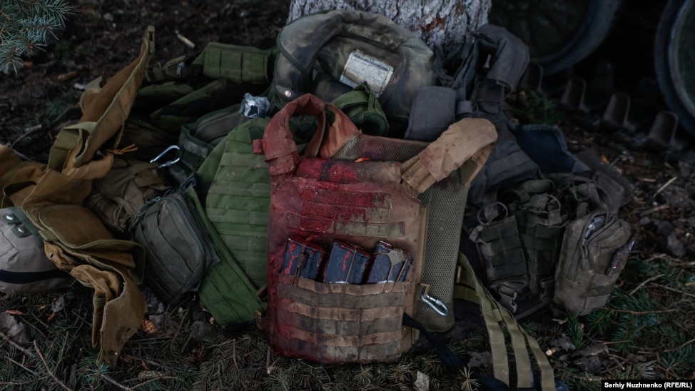 Украин аскарининг қонга беланган зирҳли нимчаси. Донецк вилояти Соледар шаҳри атрофлари, 2023 йил 23 январь