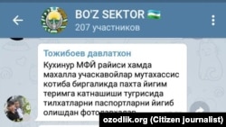 БЎЗ. “Андижон вилояти Бўз тумани Кўҳинур МФЙдан ёзмоқдамиз. Маҳаллада пахтага тайёргарлик ҳозирдан бошлаб юборилди. Участка нозири ва маҳалла вакиллари аҳолидан теримга қатнашиши ҳақида тилхат ёздириб, уларнинг паспортини ҳам йиғиб олмоқда. Тилхат ёздириш ҳам, паспорт йиғиб олиш ҳам қонунга зид-ку!”