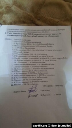 ОҲАНГАРОН. “Мен – Б.Рисқулов, Тошкент вилояти Оҳангарон шаҳридан ёзмоқдаман. “Оҳангаронцемент” АЖ раҳбарининг жорий йил 8 августдаги буйруғига кўра ишдан бўшатилдим. Раҳбариятнинг қарорини ноқонуний деб биламан. Тафсилотларга тўхталмоқчи эмасман. Аммо шуни қисқача маълум қиламанки, раҳбариятнинг қинғир иши фош бўлиб қолди ва улар ҳужжатларни сохталаштириб барча айбни менга тўнкаб ишдан бўшатишди. Мутасаддилардан вазиятни холис ўрганиб, мени қайта ишга тиклашлари, ноқонуний ушлаб қолинган маблағни қайтаришлари ва “Оҳангаронцемент” АЖдаги айбдор масъулларга чора кўришларини сўрайман”.