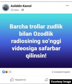 Блогер Аслиддин Камол эса "барча тролларни Озодликка қарши шарҳ ёзишга" чақирилган истеҳзоли пост қолдирди: