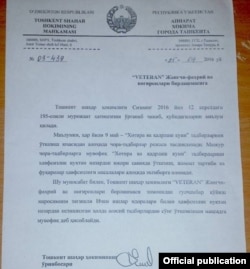 Tafsilot.uz сайти эълон қилган мактуб Тошкентда "Барҳаёт полк" акциясини уюштиришда кўмаклашган "Veteran" жангчи-фахрий ва ногиронлар бирлашмасига йўлланган ҳамда унда ИИВ билан келишилган ҳолда 9-май куни режалаштирилган тадбирлардан сўнг "гулчамбар қўйиш маросими"га рухсат берилгани айтилган.