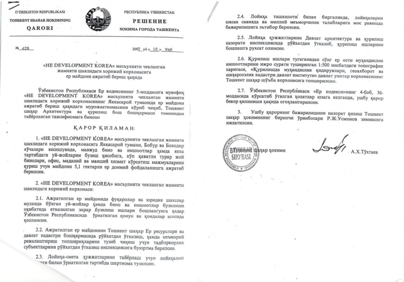 Мазкур қарорга имзо чеккан ҳоким Тўхтаев ишдан ҳайдалди, лекин Тошкентда уй ва биноларни бузиш кампанияси давом этмоқда.
